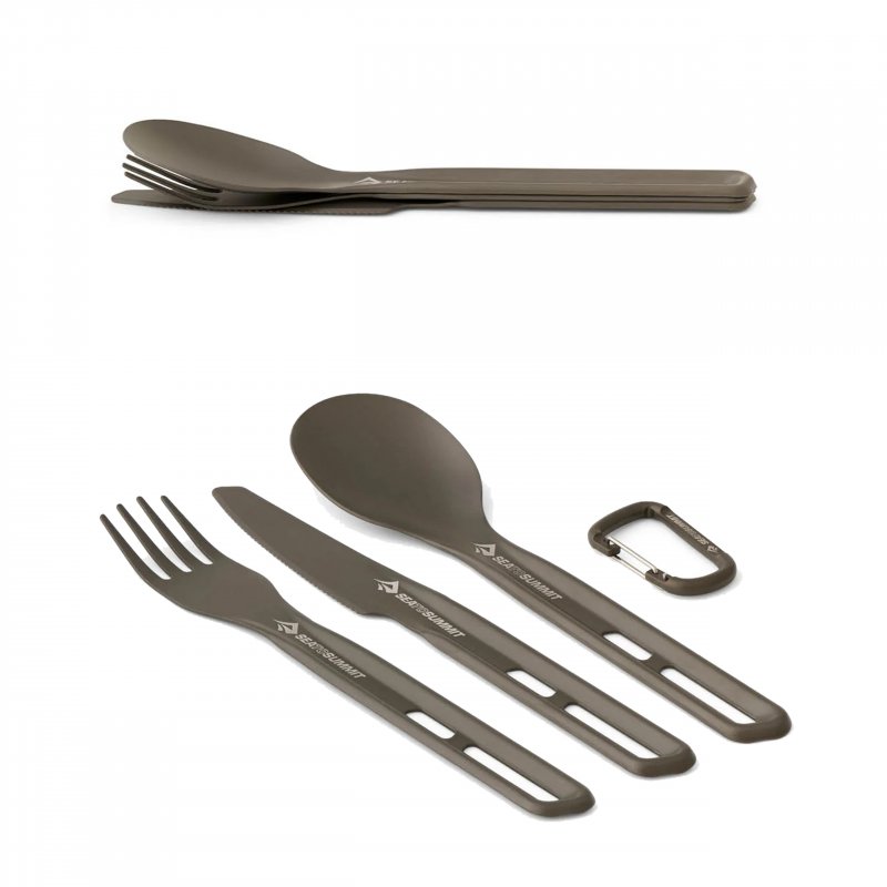 Das 3-teilige Frontier Besteck Set von Sea to Summit ist ein robustes, funktionelles und leichtes Besteck Set für Camping und Outdoor. Ob zum Picknick am Sonntag im Park, fürs Zeltlager oder im Wohnmobil - das Frontier Cutlery Set ist immer zur Hand. An dem praktischen Mini-Karabiner können die Gabel, der Löffel und das Messer des Sets, das aus hart-eloxiertem Flugzeugaluminium hergestellt ist griffbereit aufbewahrt werden. Die Griffe haben ein einzigartiges Profil, dass das Stapeln ermöglicht. Die Oberfläche ist glatt und sorgt für Genuss beim Essen.